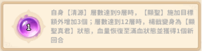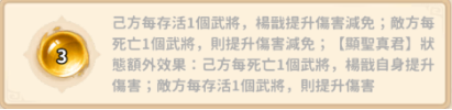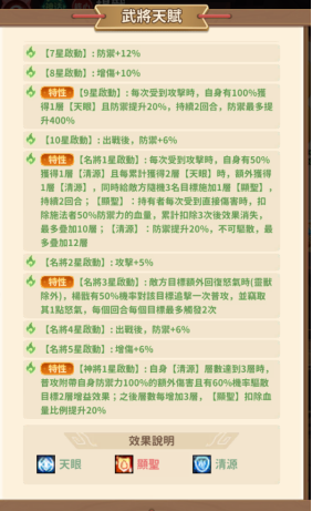 名將1星:受到攻擊會有機率獲得1層清源(提升20%防禦力)每獲得2層天眼(普攻的附加特效,提升免傷效果10%)可以額外獲得一層清源,同時給敵方的隨機武將施加一層顯聖效果。(持有該效果的敵方武將會在受到直接傷害之後再結算一次楊戩的防禦50%的傷害)在一步提升楊戩的坦度和傷害能力,防禦越高後續出傷也更高。