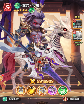 本次的道諦呂布可以說是全能的不能再全能的武將了,該有的減怒,減防都有,傷害上的斬殺也有,本身的生存能力也非常強,越戰效果也是拉滿,自己一個人基本能把全部事情都給做了,非常推薦抽取。