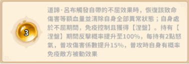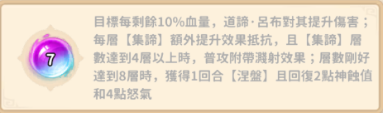 魂7:目標每剩餘10%血量,提高道諦呂布的傷害,集諦(就是普攻帶的傷害加成效果)每層額外提升效果抵抗,達到4層以上普攻會附帶濺射傷害,達到8層可以直接獲得1回合的涅盤效果並且回復神蝕值和怒氣。