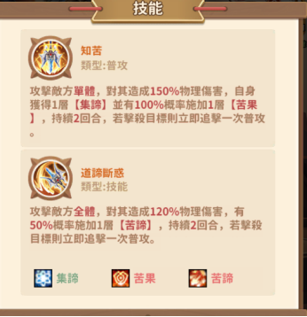 技能:攻擊敵方全體,有施加一層苦諦效果,就是前面普攻造成的免傷減少效果的層數,敵方每次行動都會消耗苦果層數等額的怒氣,如果怒氣不足,不足的轉為扣血。