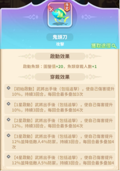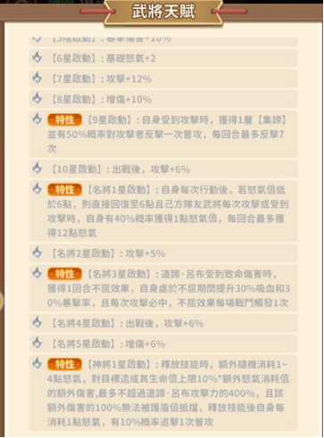 名將1星:在自己行動後,如果怒氣不滿6點就直接回復道6點,友方每次受到攻擊或者攻擊的時候都會有獲得怒氣,最多獲得12點怒氣