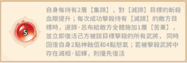 魂5:當每持有2層集諦效果(就是普攻帶的傷害加成效果)對斬殺的血限提高,成功斬殺敵方後,可以給敵方全體施加1層苦果(減少免傷效果)並且可以直接復活被斬殺的目標所擊殺的所有武將,並且回復神蝕值和怒氣