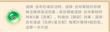 魂10:被道諦呂布擊殺的武將無法復活,如果被道諦呂布擊殺的時候持有5層苦果(減少免傷效果),無法被任何效果進行復活,然後他通過名將1星的效果回復的怒氣,每4點,能夠追擊一次技能。
