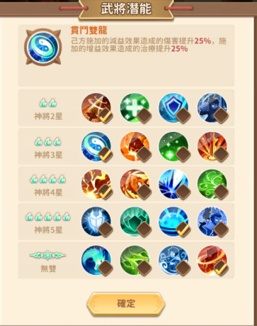 名將3星:受到致命傷害可以獲得不屈效果,並且在此效果下提升一定的吸血和暴擊率,並且攻擊必中,每次戰鬥觸發一次